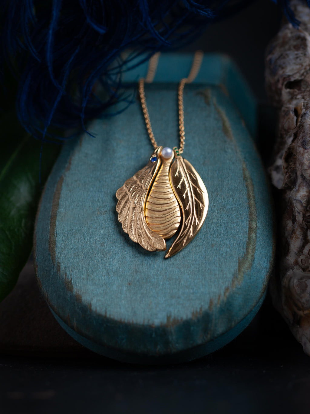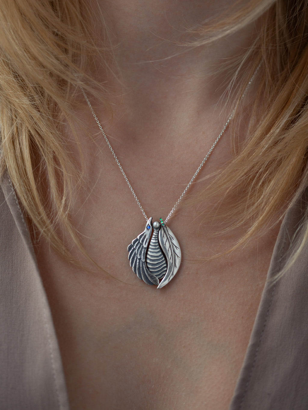 Handcrafted Silver Charm Necklace with Pearl, Emerald and Nature-Inspired Design