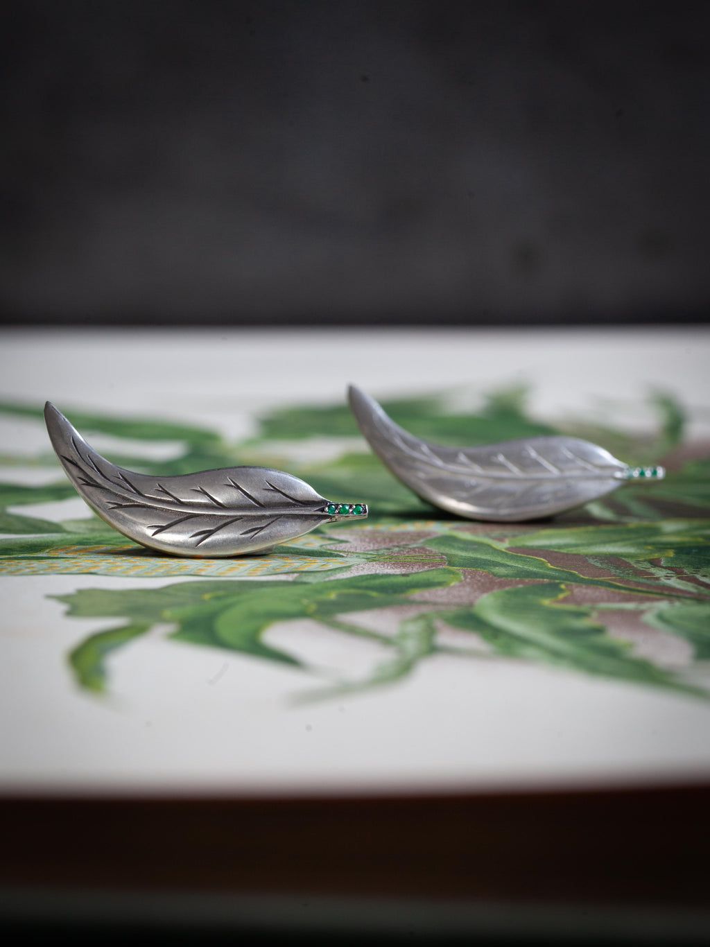 Earth – a silver leaf charm adorned with three 1mm glistening green Emeralds