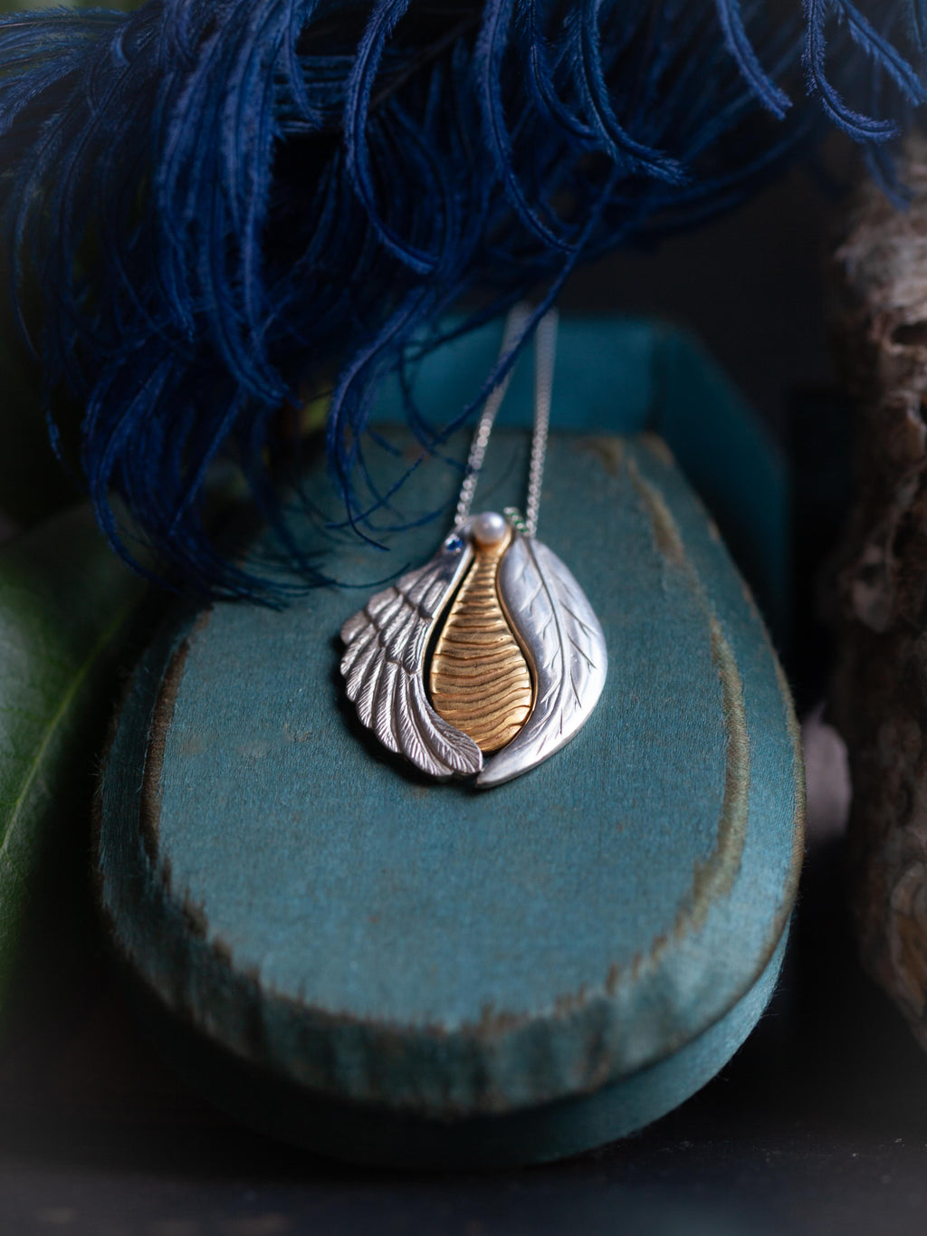 Sky – a delicate silver bird feather charm set with a 1.75mm blue Sapphire.