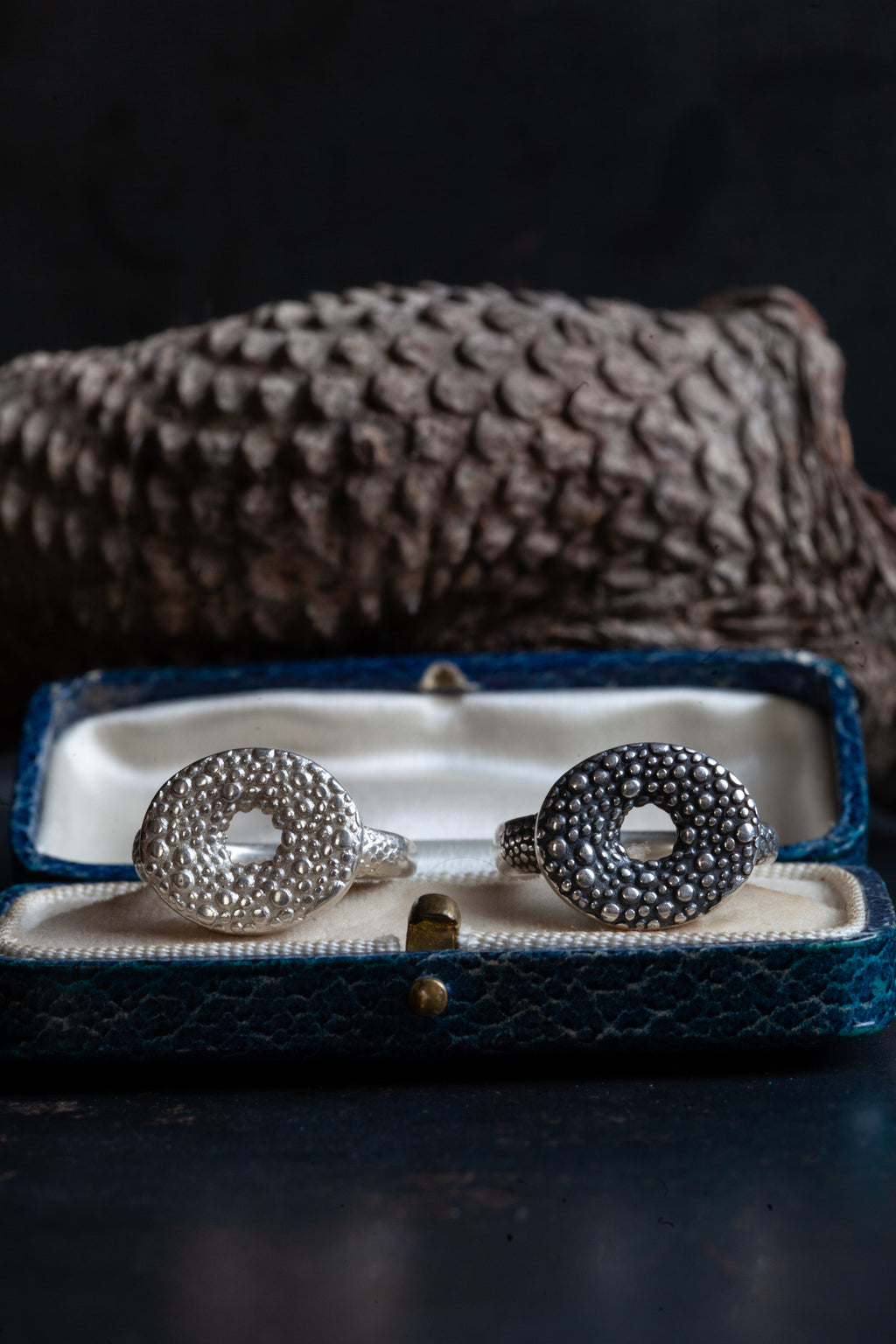 I like playing with texture and recesses in my work and these rings combine both of those things. The oval centrepiece is scattered with a bubble texture with extends onto the band of the ring. The hole in the centre shows a flash of skin beneath and reminds me of the intrigue of a lizard's eye.