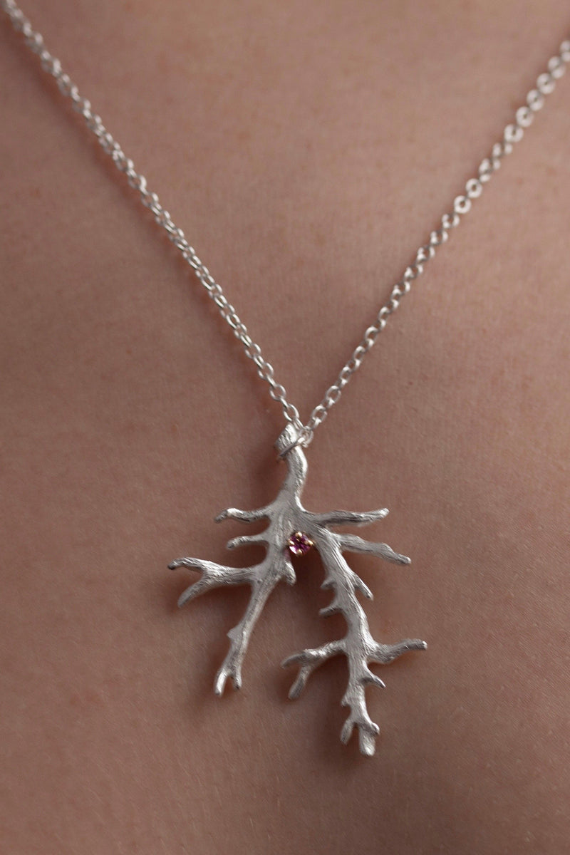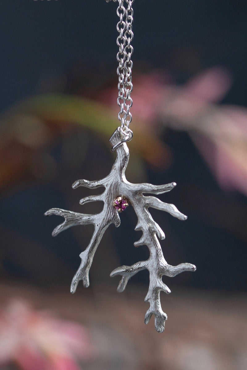 My unusual branch pendant, set with a Pink Tourmaline, October's birthstone, hangs from a delicate trace chain that can be worn at two lengths, is sure to appeal to nature lovers.