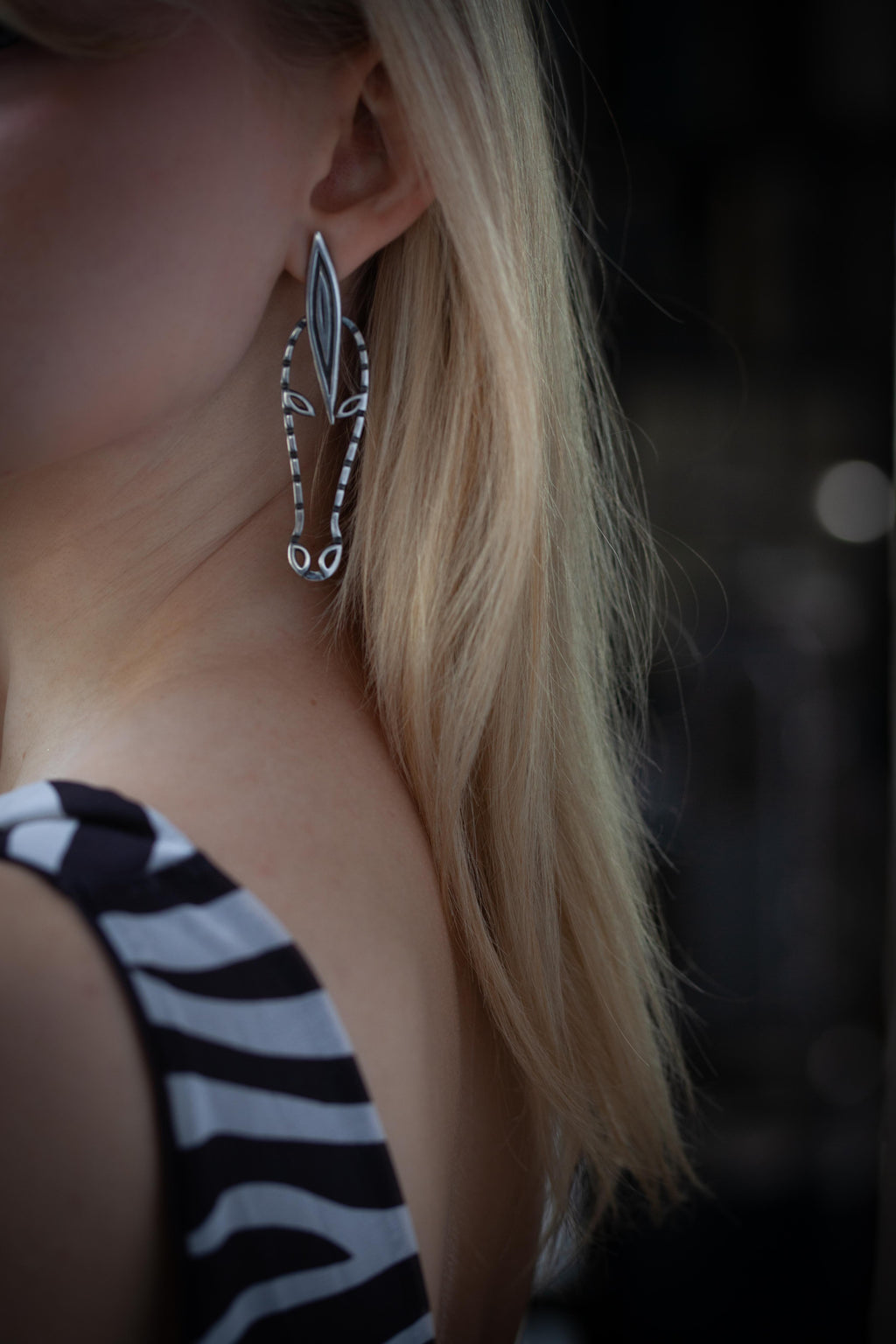 These unusual sterling silver statement earrings are inspired by the bold patterns of zebras and the striking forms of traditional tribal masks. Designed to be both eye-catching and wearable, they are sure to turn heads and become a talking point.